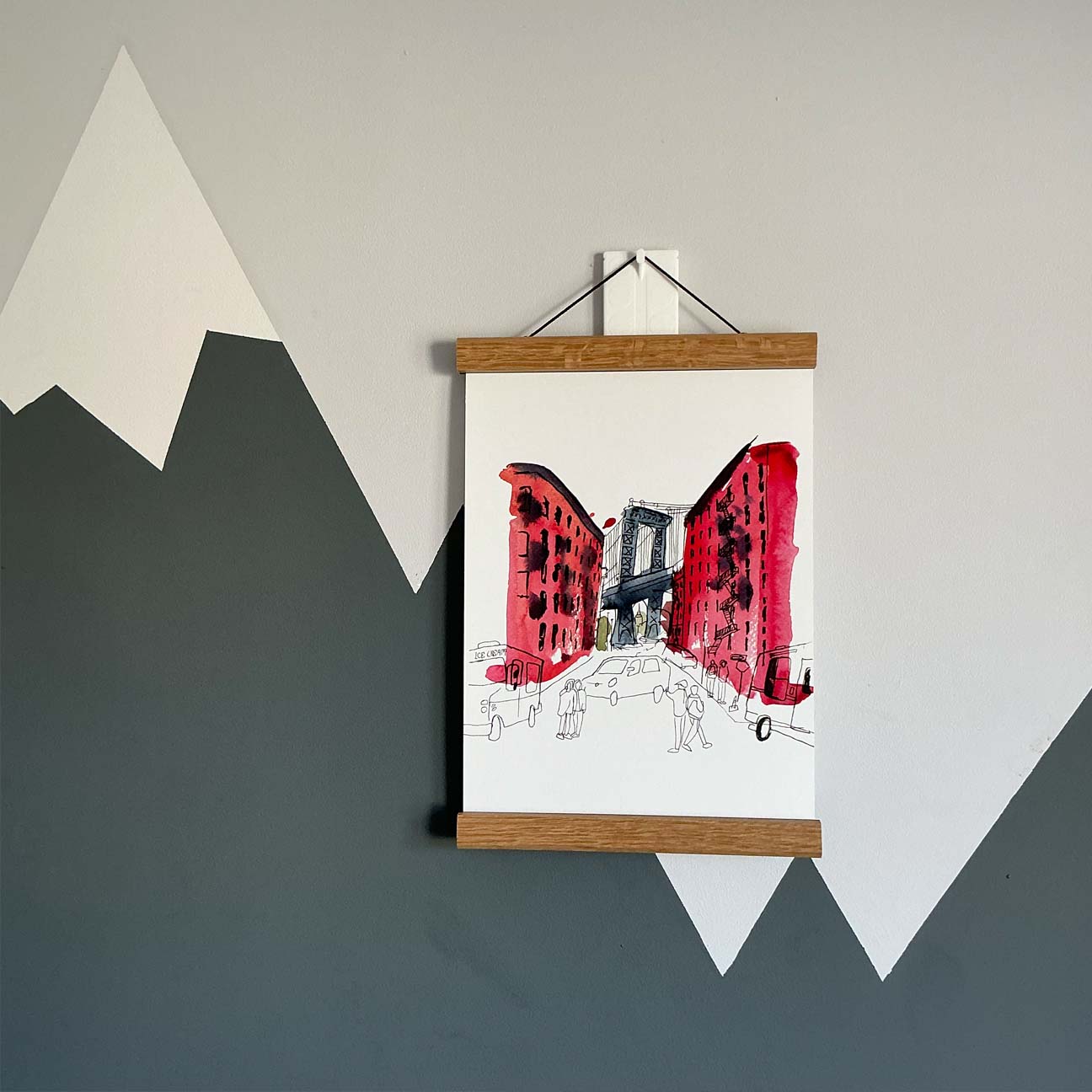 This vibrant artwork captures one of the most iconic sights in New York City - the Dumbo view of the Manhattan Bridge! Perfectly framed by the red-bricked historic buildings of Brooklyn, this one is a real beauty and I'm really proud of it.