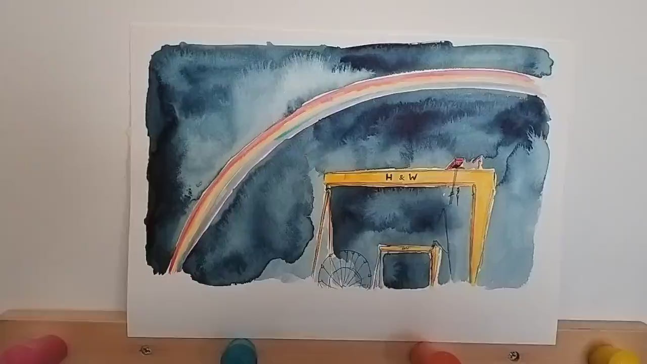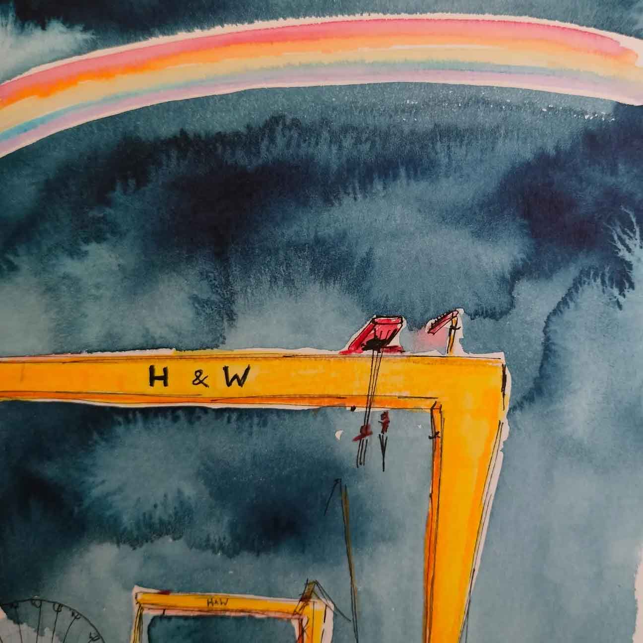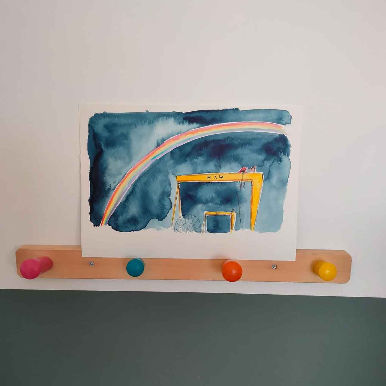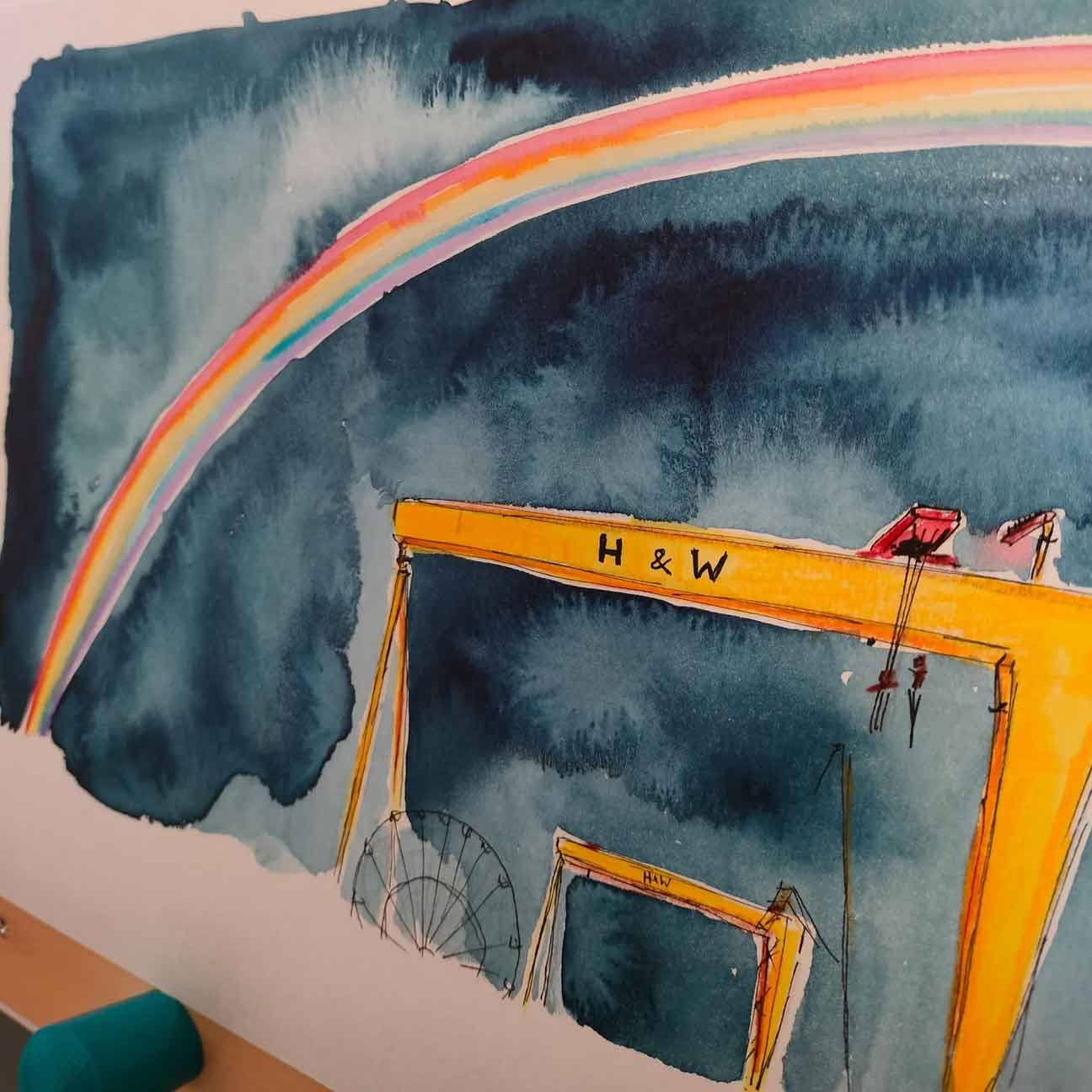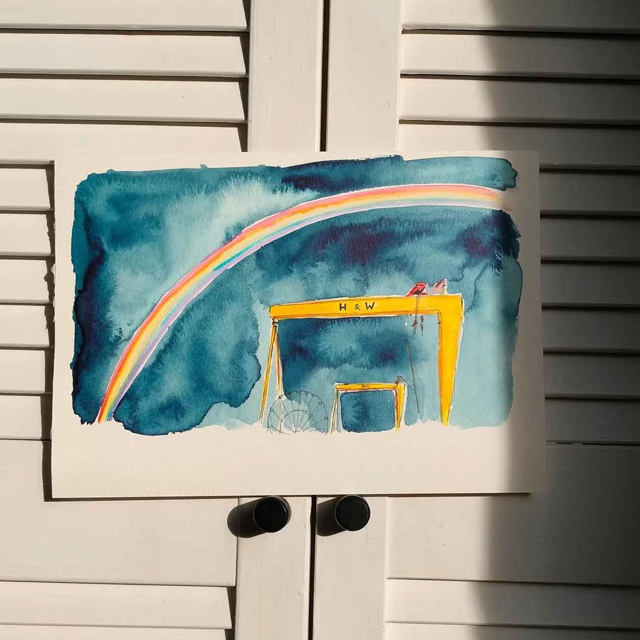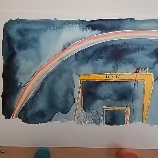 This original watercolour captures a vibrant rainbow arching over the iconic Belfast cranes, set against a rich, inky indigo sky. There’s something magical about seeing a rainbow over these giants, and I loved bringing that moment to life on paper. It’s a real beauty and would look stunning in a crisp white mounted frame.