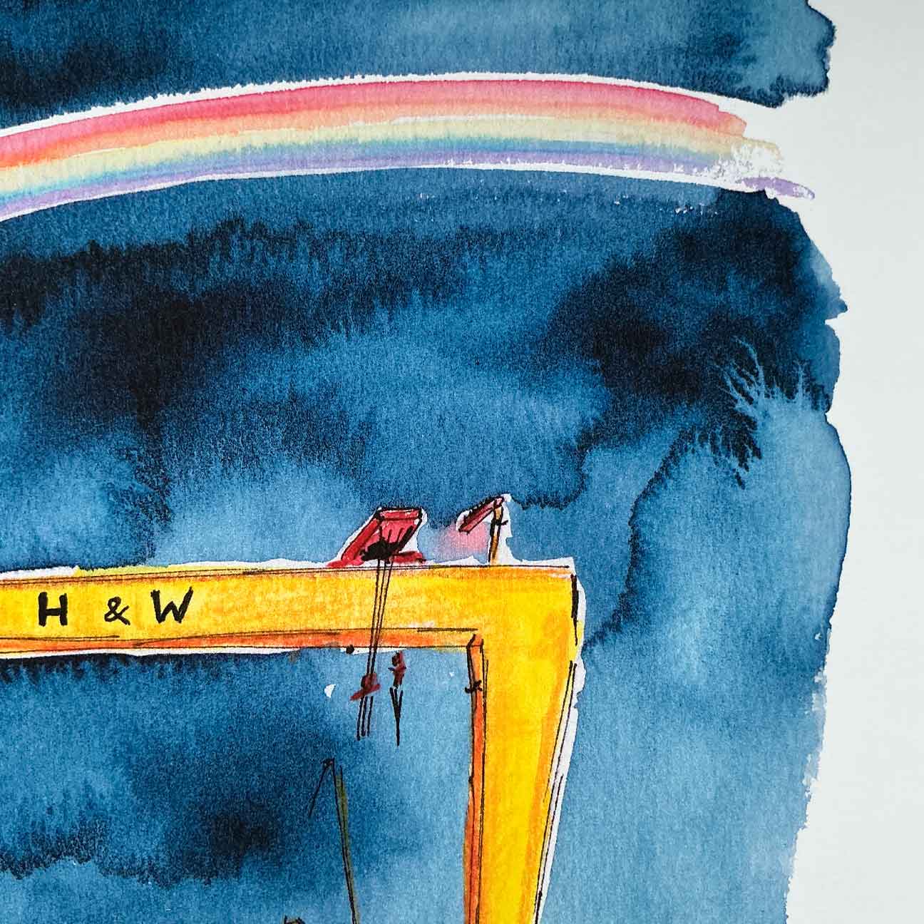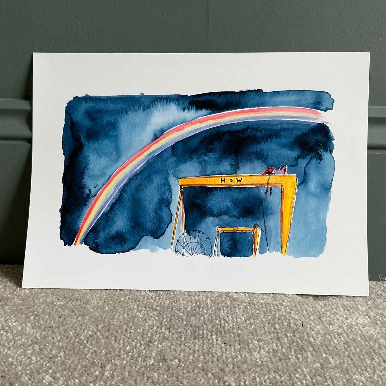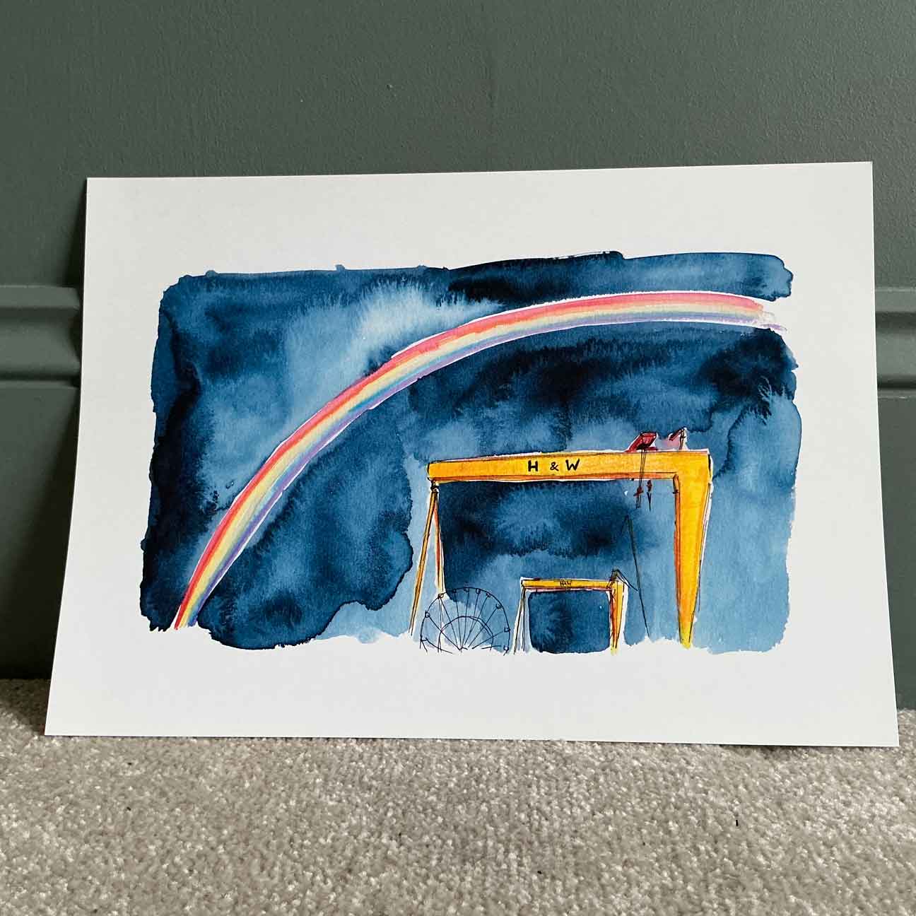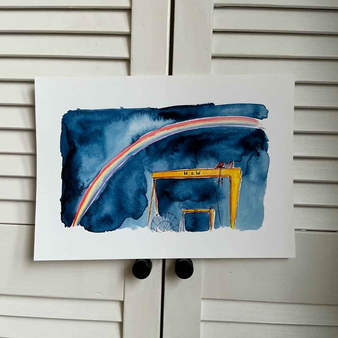 This print is taken from my original watercolour painting, capturing a vibrant rainbow arching over the iconic Belfast cranes against a dramatic indigo sky. There’s something almost magical about seeing a rainbow over these giants, and I wanted to bottle that feeling on paper. This piece is bold, vibrant, and would look incredible in a crisp white frame.