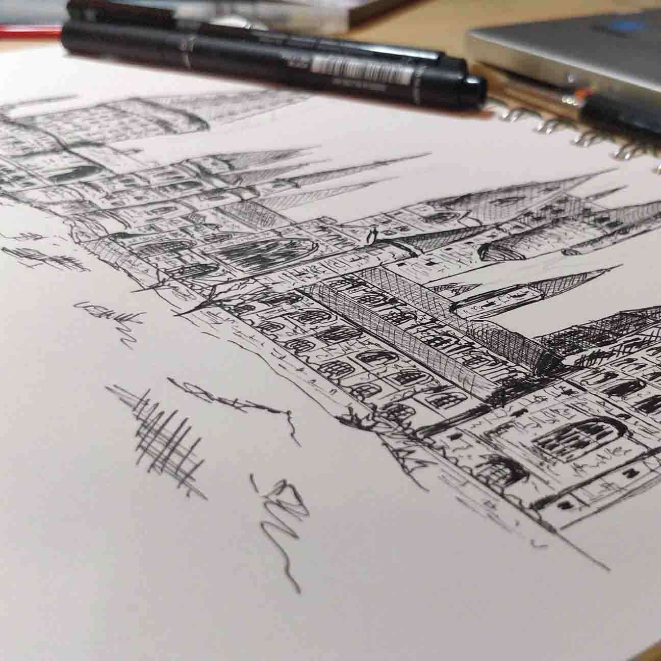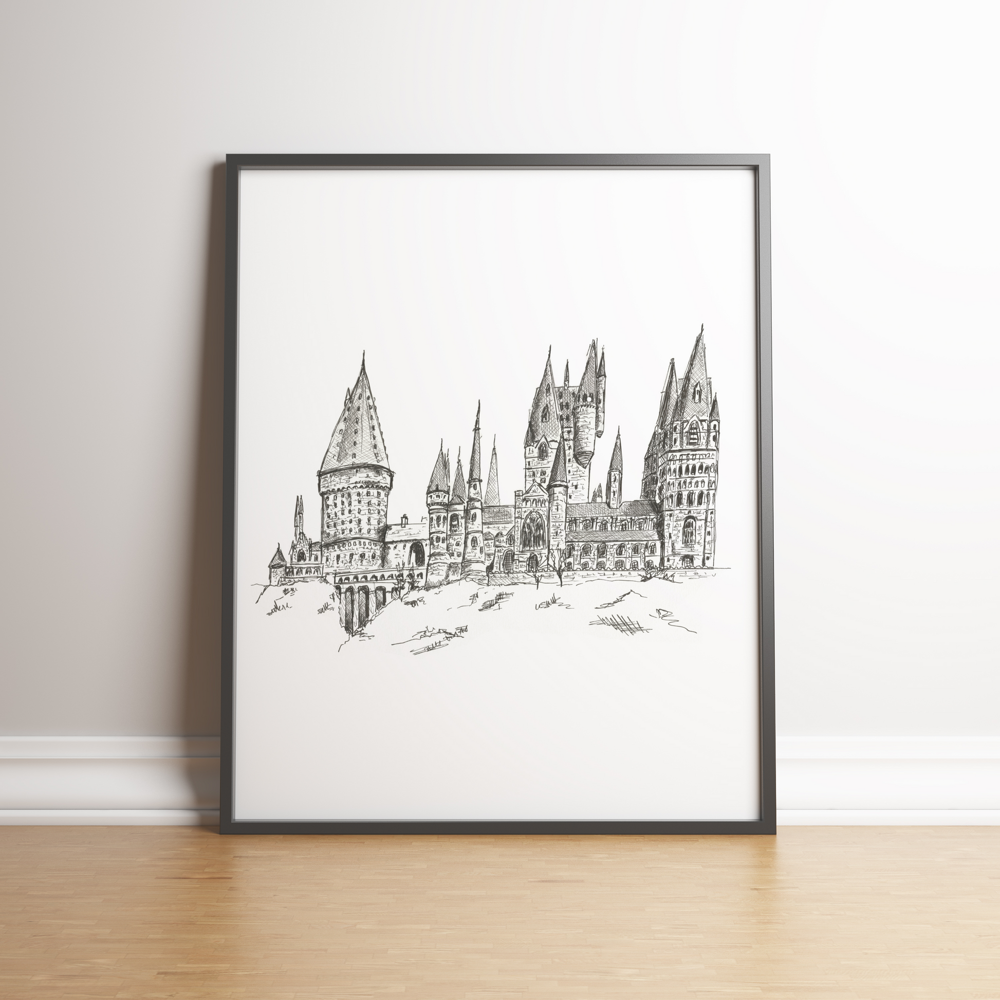 This is a detailed print based on my original pen drawing of Hogwarts Castle. Not drawn on site, but I took quite a lot of reference photos when I visited the model of Hogwarts at the Harry Potter Studios in London when I was blown away by it and based it off those pictures.