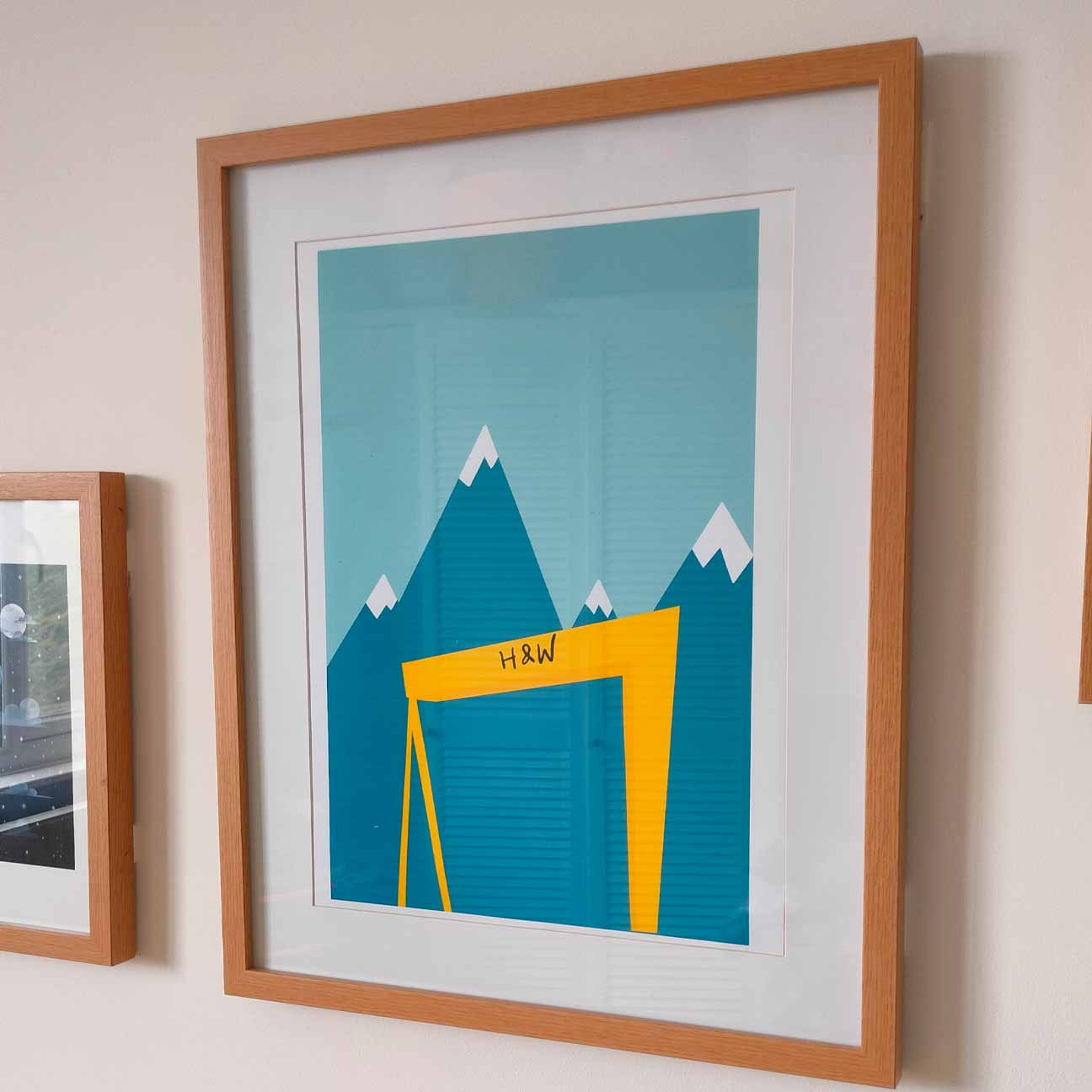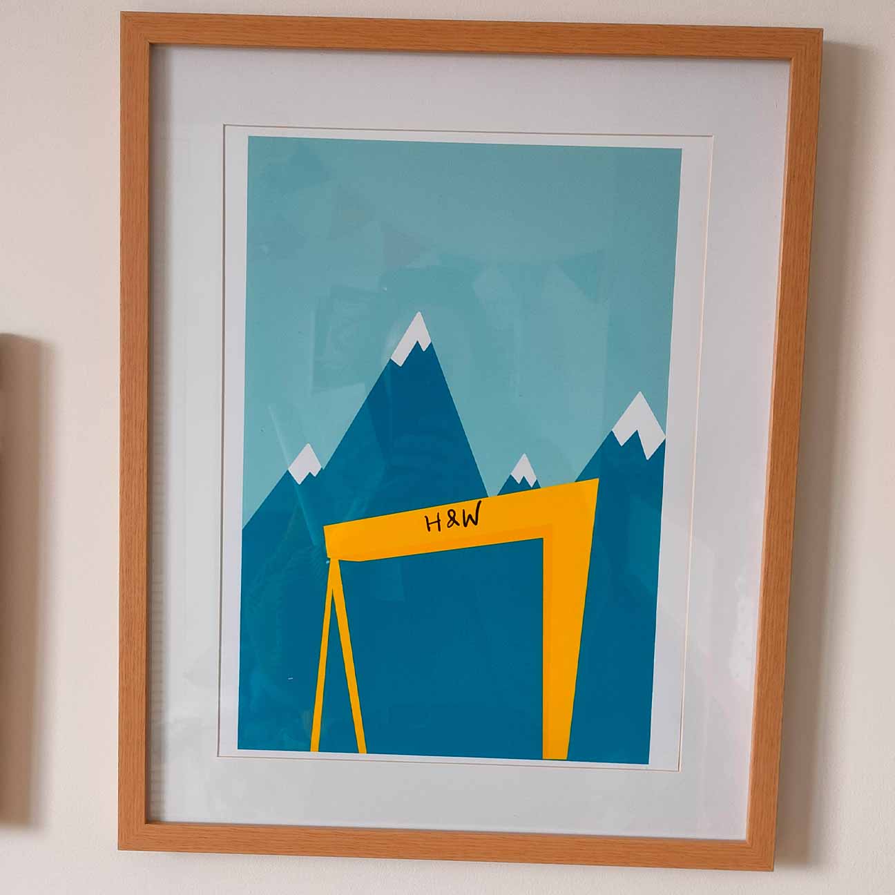 A lone Harland & Wolff crane (is it Samson or Goliath?!) stands tall against snowy peaks and a crisp blue sky - a little mix of home, heritage and imagination.