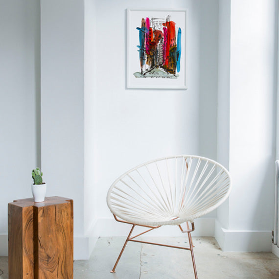 This piece is more abstract than some of my other work, with washes of pinks, reds and blues merging to create a dreamy, energetic cityscape. If you’re after urban art that brings colour, movement and memory to your walls, this one might just be it.