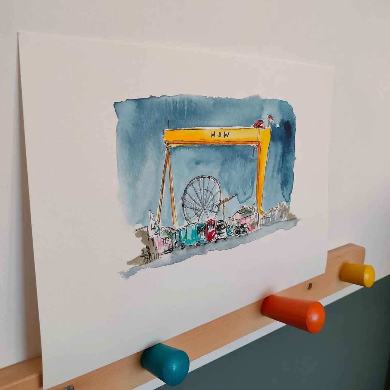 This original watercolour painting captures the Harland and Wolff cranes in Belfast - one of the city’s most iconic sights. There’s something special about the fairground setting up at the foot of the cranes - it’s a sight that never gets old. This painting captures that moment, set against a bright blue sky.